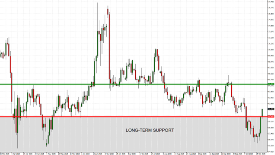 - LONG-TERM SUPPORT AREA BELOW THE PSYCHOLOGICAL MARK OF $60: Crude oil price has recently tested levels below $60, which has been acting as a support area since early 2021. However, there remains a risk of a potential breakout below this level if market conditions change.