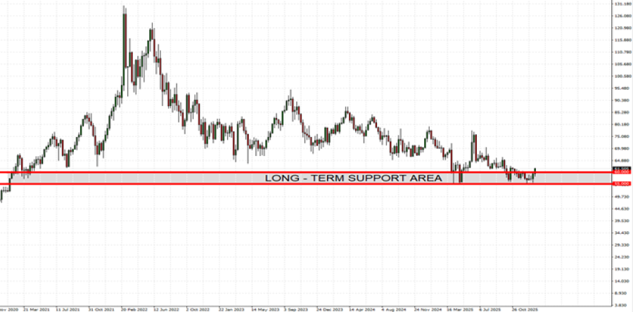 - SUPPORT AREA: $55 - $60. According to the weekly chart below, crude oil has tested levels between $55 and $60 five times since 2021.