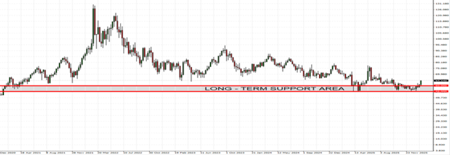 - SUPPORT AREA: $55 - $60. According to the weekly chart below, crude oil has tested levels between $55 and $60 five times since 2021.
