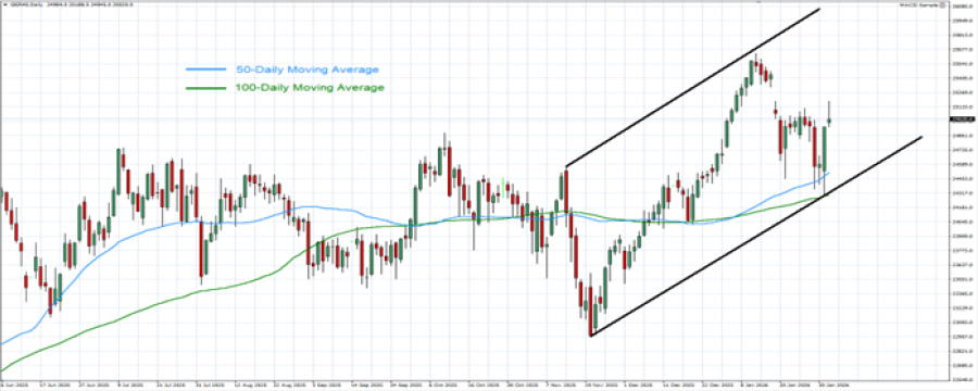 • LONGER-TERM UPTREND: The black-lined uptrend channel depicted by the chart below shows that GER40 prices have maintained their uptrend in general since November 2025. However, there remains a risk of a potential breakout below this level if market conditions change.