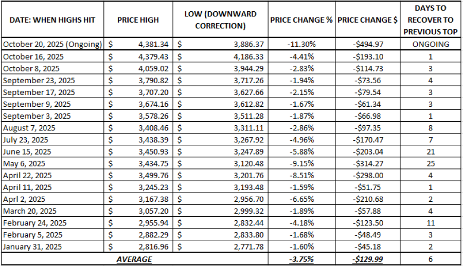 - CURRENT: THE CURRENT DOWNWARD CORRECTION IS THE 18TH THIS YEAR. Since October 20, 2025, gold has lost around $495 after testing $3,886.37 on October 28, 2025.