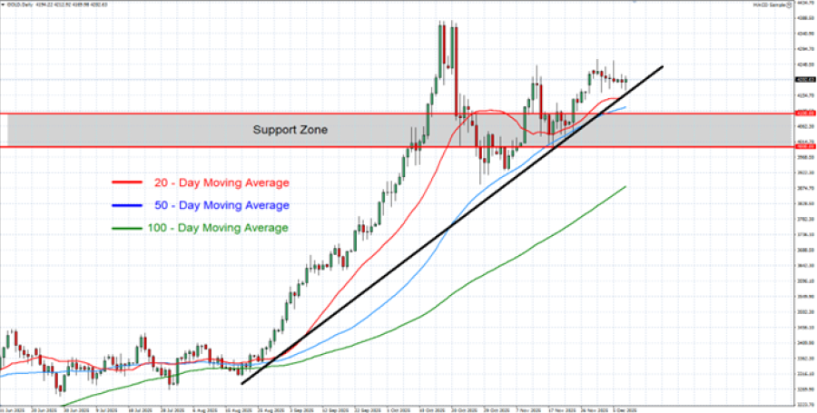 - TECHNICAL SUPPORT: $4,100 - 4,000. Over the past month, after the most recent decline in gold prices, gold prices have tried to maintain near-term support between $4,100 and $4,000, an area that has been tested several times since late October 2025.