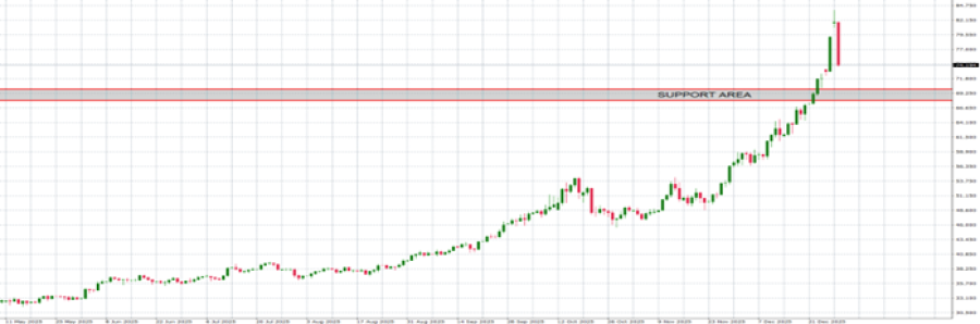 • SILVER PRICE HIT A NEW ALL-TIME HIGH ON DECEMBER 28, 2025 ($83.895). Silver price has broken out to a new all-time high of $83.895, confirming the strong uptrend since the beginning of 2025. The zone between $70 and $68 has now become silver’s new support area. Silver has now gained more than 160% so far in 2025. However, the price could also decline.