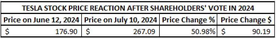 • LAST TIME (JUNE 13, 2024): ANNUAL SHAREHOLDER MEETING 2024. TESLA’S SHAREHOLDERS VOTED IN FAVOUR OF CEO ELON MUSK'S PAY. According to Reuters, Tesla shareholders approved CEO Elon Musk's $56 billion pay package, a big thumbs-up to his leadership and an incentive to keep his focus on his biggest source of wealth. The approval underscored the support that Musk enjoys from Tesla's retail investor base, many of whom are vocal fans of Musk. The proposal passed despite opposition from some large institutional investors and proxy firms.