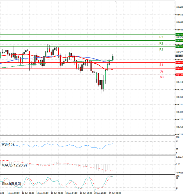 The AUD/USD currency pair has advanced upward as investors were moving away from the US dollar following the prospect of a Israel - Iran ceasefire. In Australia there are no data releases scheduled today. In the US, CB Consumer Confidence for June (99.1 exp) and Fed Chair Powell will give testimony to Congress (15:00 GMT+1).