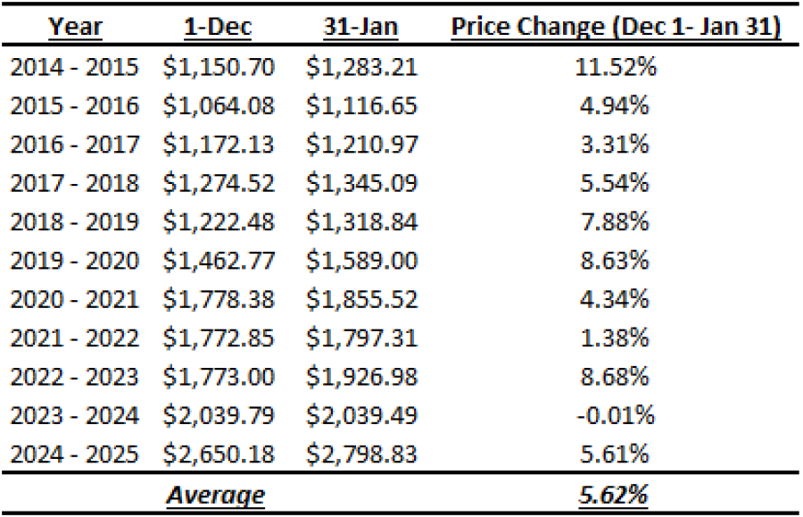 - ESTADÍSTICAS: EL ORO SUBIÓ 5,62% EN PROMEDIO ENTRE DICIEMBRE Y ENERO (2014-2025). Históricamente, el oro subió entre diciembre y enero casi todos los años desde el período 2014-2025.