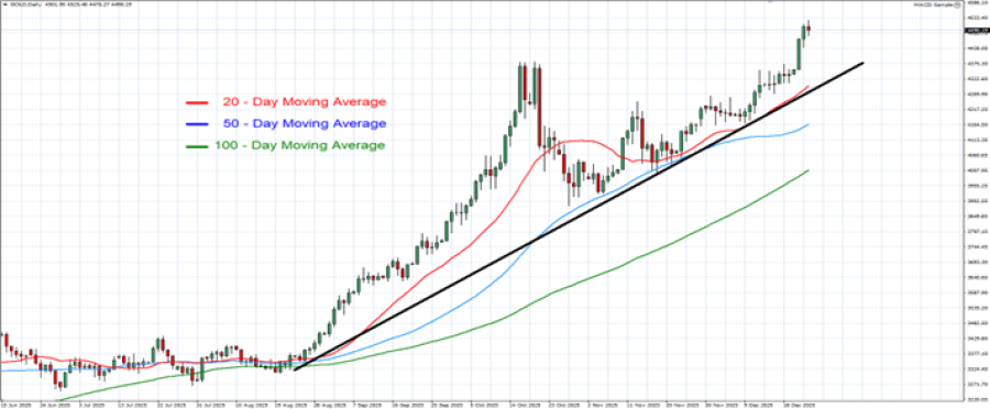 LA TENDENCIA A MEDIO PLAZO ES AL ALZA. La tendencia general del oro es alcista desde principios de año y se está acelerando desde mediados de agosto de 2025.