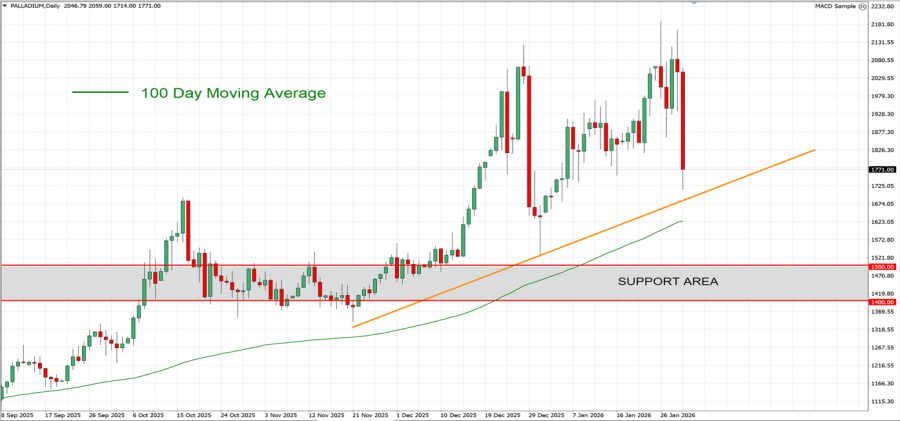 AREA DE SOPORTE: $1500 – $1600. Esta zona representa su próxima área de soporte para los precios del paladio.