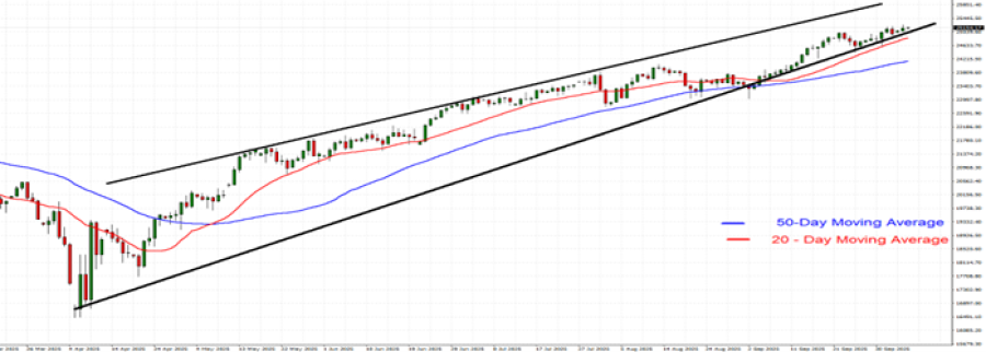 MEDIAS MÓVILES. Las medias móviles de 20, 50 y 100 días presentan una pendiente ascendente y se encuentran por debajo del precio actual, lo que confirma aún más la tendencia alcista. Mientras el índice se mantenga por encima de estas medias y dentro del canal, la estructura general sugiere la continuación de la fase ascendente. Sin embargo, un movimiento por debajo de las medias móviles podría indicar una posible pausa o un retroceso correctivo tras un período prolongado de movimiento alcista.