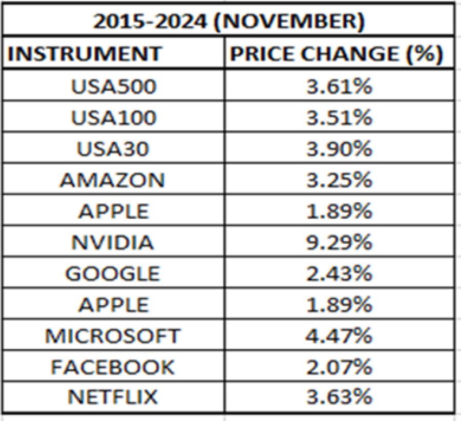 ACCIONES INDIVIDUALES: Los principales componentes del USA500, como NVIDIA (+9,29%), Microsoft (+4,47%) y Netflix (+3,63%), históricamente han tenido un desempeño positivo en noviembre.