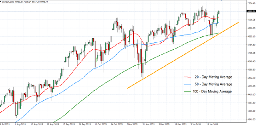 PRECIO DE LA ACCIÓN: USA500 ALCANZÓ UN NUEVO MÁXIMO HISTÓRICO EL 13 DE ENERO DE 2026 (7035,74). El precio del USA500 subió alrededor de un 16% en 2025, prolongando su tendencia positiva de 2024 (+23,20 %) y 2023 (+24,65 %). Sin embargo, también podría bajar.