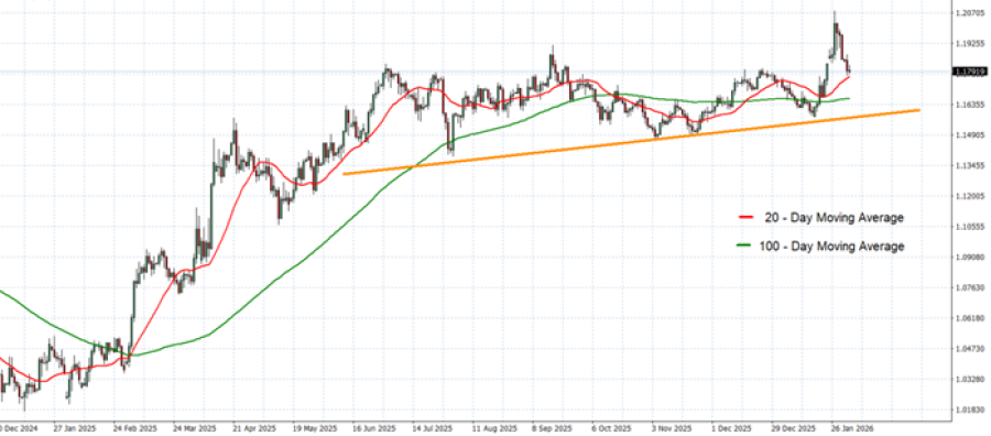 - UZLAZNI TREND OD STUDENOG 2025: Par ostaje u srednjoročnom uzlaznom trendu, podržan rastućom dugoročnom linijom (narančasta) i jasnim slijedom viših i maksimuma i minimuma od početka 2025. godine.