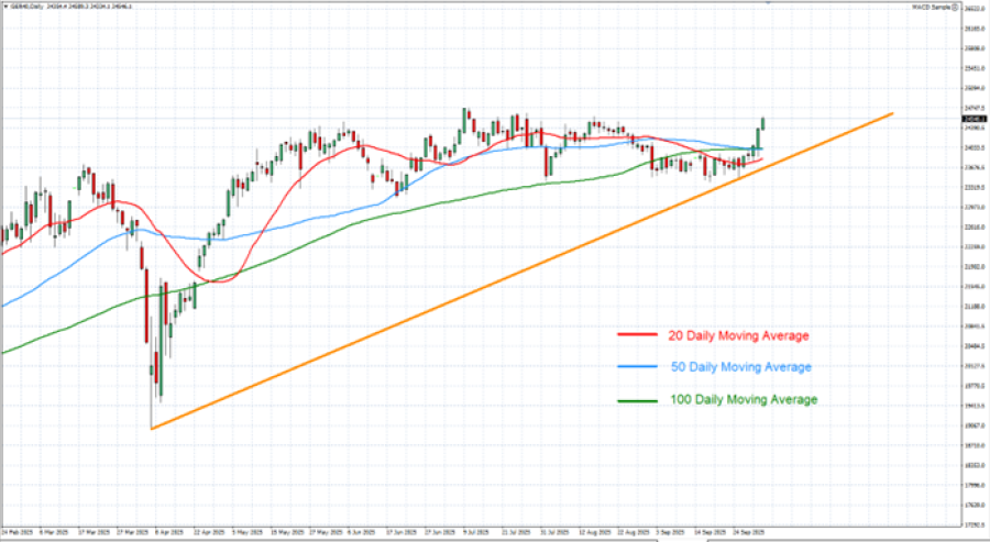 - GER40 OSTAJE IZNAD 20-DNEVNIH, 50-DNEVNIH I 100-DNEVNIH PROSJEKA KRETANJA: Dnevni grafikon u nastavku pokazuje da je GER40 i dalje iznad tri tehnički važna prosjeka kretanja, što ukazuje na kontinuirani uzlazni trend. Ipak, trend bi se mogao preokrenuti ako cijene padnu ispod tih triju prosjeka.