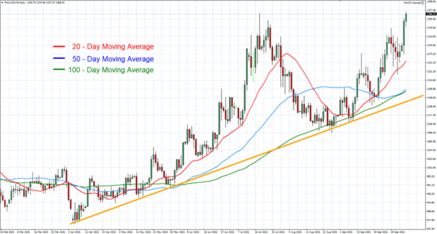 - UZLAZNI TREND OD TRAVNJA 2025: Kao što se može vidjeti sa dnevnog grafikona ispod, paladij je u stabilnom uzlaznom trendu uz podršku uzlazne dijagonalne linije trenda (narančasta) od travnja 2025. Međutim, cijena bi mogla pasti.