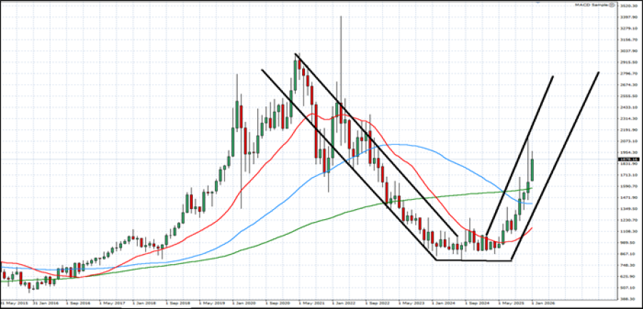 - V-OBLIK OPORAVKA I POZITIVAN MOMENTUM: Kao što je prikazano na grafikonu, paladij je formirao oporavak u obliku slova V nakon što je uspostavio dugoročnu bazu oko 800-900 dolara. Ovaj oporavak ukazuje na poboljšanje raspoloženja na tržištu i obnovljeni interes.