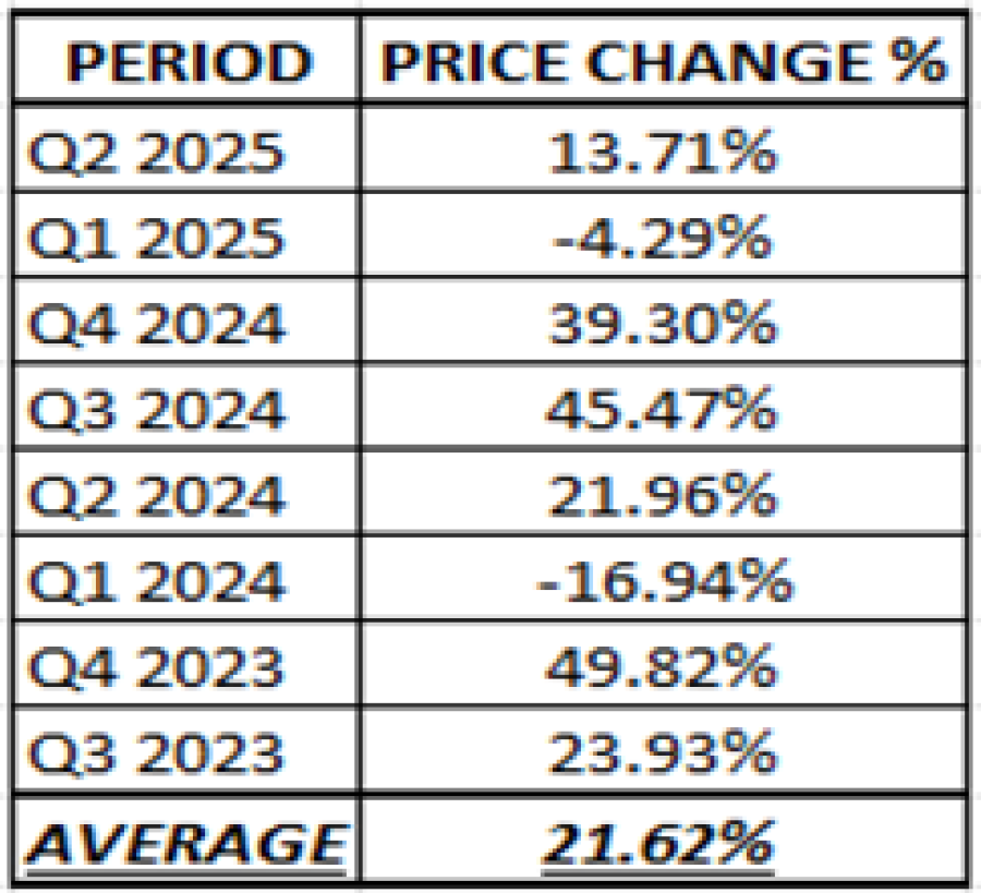 - UČINAK DIONICA (U POSLJEDNJIH 8 TROMJESEČJA): CIJENA DIONICA RASLA JE U PROSJEKU ZA 21,62% U TJEDNU NAKON OBJAVLJIVANJA TROMJESEČNIH IZVJEŠTAJA. Tablica u nastavku pokazuje da je cijena dionica pala samo dva puta od ukupno 8 u roku od tjedan dana od objavljivanja financijskog izvještaja. Iz tablice se također vidi da je cijena dionica rasla u prosjeku za 21,62% u roku od tjedan dana od objave izvještaja. Palantir je izvješće za 2. tromjesečje objavio 4. kolovoza 2025, a cijena dionica porasla je za 13,71% u narednih tjedan dana.