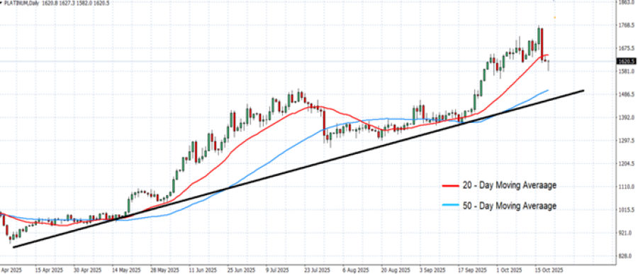 - STRUKTURA UZLAZNOG TRENDA: Uzlazna linija (crna) koja traje od travnja 2025. ostaje nepromijenjena. Sve dok se platina drži iznad 50-dnevnog pomičnog prosjeka i linije trendova, širi izgledi ostaju pozitivni.