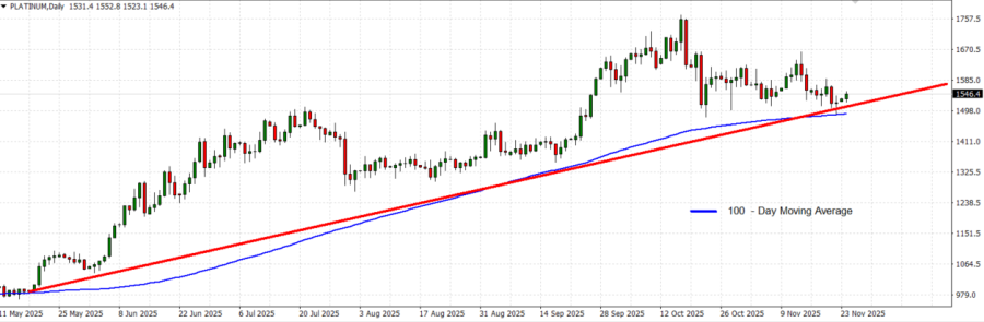 - DNEVNI POMIČNI PROSJEK (MA): Cijena ostaje iznad uzlaznog 100-dnevnog pomičnog prosjeka, što pojačava ukupnu strukturu rasta. Sve dok platina ostaje iznad linije trenda i pomičnog prosjeka, srednjoročni izgledi ostaju pozitivni.