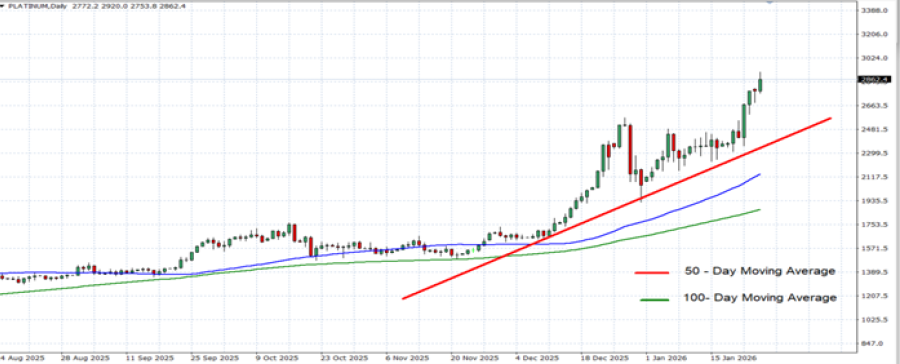 - KRETANJE CIJENA: Cijena platine je dosegla najvišu razinu od 2,920 dolara (26. siječnja 2025). Od početka mjeseca (siječanj) cijena je već porasla za oko 40%.