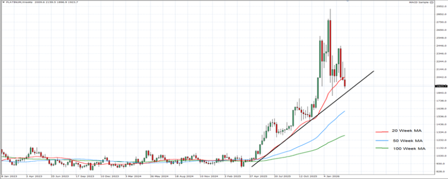 - POSLJEDICE RATA NA PLATINU: zatvaranje Hormuškog tjesnaca povećalo je cijene energije za rudnike Južne Afrike i Zimbabvea. Rizici povezani s isporukom platine iz Rusije mogu dovesti do gubitka više od 10% svjetske platine. Industrijska potražnja za komponentama za rakete i bespilotne letjelice raste, dok kašnjenja u rafinerijama, logistički prekidi, veće fizičke premije smanjuju dostupnu opskrbu, trend koji se povećava kako se sukob nastavlja.