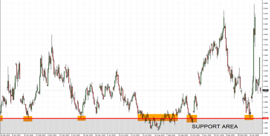 - Podrška: 3 USD. Od kraja 2024. cijene prirodnog plina održavaju snažnu potporu na 3 dolara. Od kraja 2024. testirao je razinu od 3 dolara sedam puta, potvrđujući da je ta zona snažna podrška.