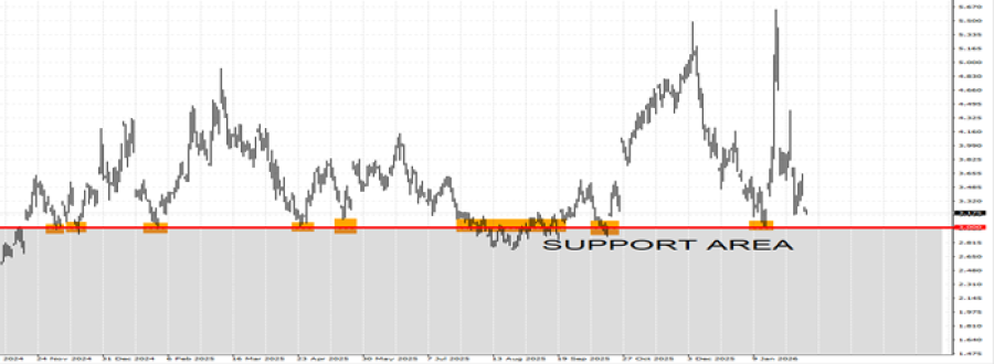 - Podrška: 3 USD. Od kraja 2024. prirodni plin je održavao snažnu potporu oko 3 dolara, testirajući ovo područje osam puta i potvrđujući ga kao snažno područje podrške. Međutim, cijena se također može smanjiti.
