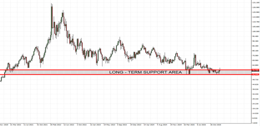 - (16. PROSINCA): CIJENA SIROVE NAFTE JE DOSEGLA NAJNIŽU RAZINU OD SVIBNJA 2025. (54.865 USD). Cijena sirove nafte je dosegla najnižu razinu od veljače 2021. Sirova nafta se trenutno kreće oko 59 USD, a nalazi u blizini svoje dugoročne zone podrške između 55 i 60 USD.