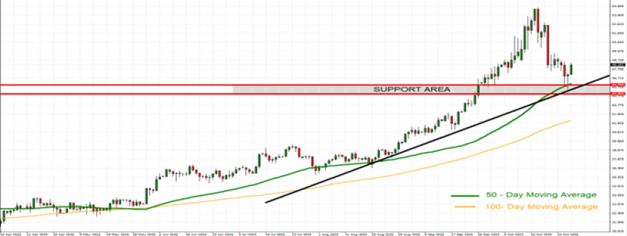 - UZLAZNI TREND U 2025: Nakon pada cijena u ožujku-travnju, cijene srebra od tada se kreću uzlaznim trendom, kao što je prikazano na donjem dnevnom grafikonu i linijom uzlaznog trenda. Od početka 2025. cijena srebra neprestano raste, dosegnuvši novi najviši nivo u listopadu (54.454 USD), što predstavlja rast od oko 88%. Međutim, cijena se također može smanjiti.