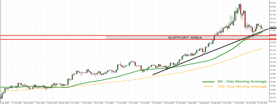 - UZLAZNI TREND U 2025: Nakon pada cijena u ožujku-travnju, cijene srebra od tada se kreću uzlaznim trendom, kao što je prikazano na donjem dnevnom grafikonu i linijom uzlaznog trenda. Od početka 2025. cijena srebra neprestano raste, dosegnuvši novi najviši nivo u listopadu (54.454 USD), što predstavlja rast od oko 88%. Međutim, cijena se također može smanjiti.