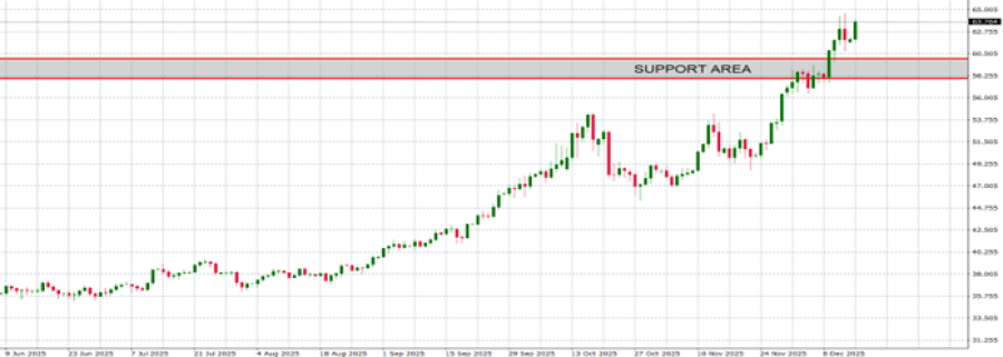 - Podrška: 60-58 USD. U prosincu su cijene srebra prvi put u povijesti porasle iznad razine od 60 dolara. Nakon proboja, zona između 60 i 58 dolara postala je nova zona podrške za srebro.