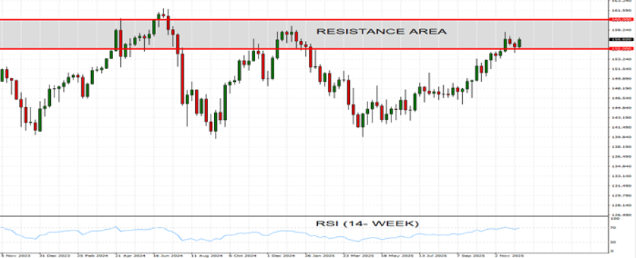 - JAK OTPOR: 160-155. Ovo područje djeluje kao glavni otpor od travnja 2024. U posljednjih godinu i pol dana, par USDJPY je testirao ovo područje tri puta.