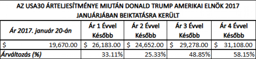 - STATISZTIKÁK (AZ USA 30 INDEX TRUMP ELSŐ HIVATALI IDEJE ALATT (2017 – 2021)): AZ USA30 INDEX 33.11%-KAL EMELKEDETT DONALD TRUMP, MINT AZ USA 45. ELNÖKÉNEK BEIKTATÁSA UTÁNI ELSŐ 12 HÓNAPBAN (2017. JANUÁR 20. – 2018. JANUÁR 20.). Emellett az USA30 index 58.15%-kal nőtt Donald Trump teljes első hivatali ideje alatt, amikor az USA 45. elnökeként szolgált.