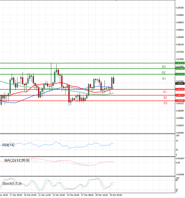 АУД/УСД беше малку на повисоко ниво за време на попладневната сесија. Моментално се тргува на ниво од 0,6703. Австралија немаше планирано известувања за економски настани. Соединетите Американски Држави ќе го пријават кварталниот БДП за за К4 подоцна денес. Првичните барања за невработените исто така треба да се пријават.
