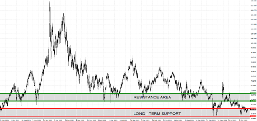 PRICE ACTION (OCTOBER 17 – OCTOBER 24): CRUDE OIL PRICE ROSE FROM $56.90 TO $62.57 (an increase of 9.96%). Before the collapse of the Putin–Trump summit and Trump’s sanctions on Russia’s Lukoil and Rosneft, crude oil had been declining to test $56.90 on some potential optimism. However, the summit efforts collapsed and, moreover, Trump announced oil sanctions on Russia, which caused crude oil prices to rise to 62.57 on October 24.