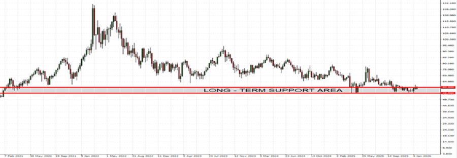 - BREAKING (DECEMBER 16, 2025): CRUDE OIL HAS TESTED ITS LOWEST RATE SINCE FEBRUARY 2021 ($54.865). The crude oil price has tested its lowest rate since February 2021. Currently, crude oil is trading around the $59 mark, floating around its longer-term support area between $55 and $60. However, it could also decline.