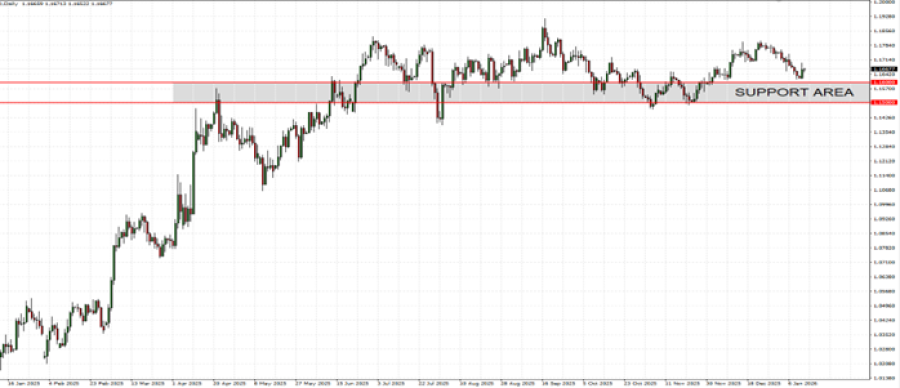 - SUPPORT AREA: 1.1500 – 1.1600. The area between 1.1500 and 1.1600 has acted as strong support since mid-2025 and has remained relevant at the start of 2026. As long as EUR/USD trades above this area, positive market sentiment could be expected.