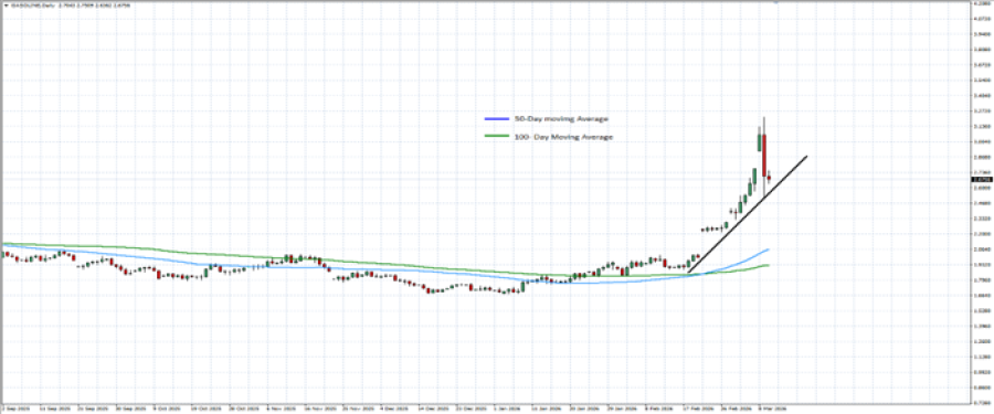 - DAILY MOVING AVERAGES CONFIRM POSITIVE MOMENTUM: The 50-day moving average (blue) is trending higher, indicating strengthening short-term momentum. The 100-day moving average (green) is also rising and remains below the current crude oil price, reinforcing the broader positive structure. With price trading above both moving averages, the overall sentiment remains positive. However, the price could also decline.