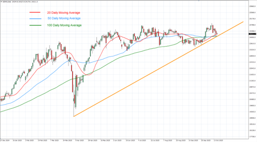 • LONGER-TERM TREND LINE: The orange trend line depicted by the chart below shows that GER40 prices have maintained their uptrend in general since April 2025. However, there remains a risk of a potential breakout below this level if market conditions change.