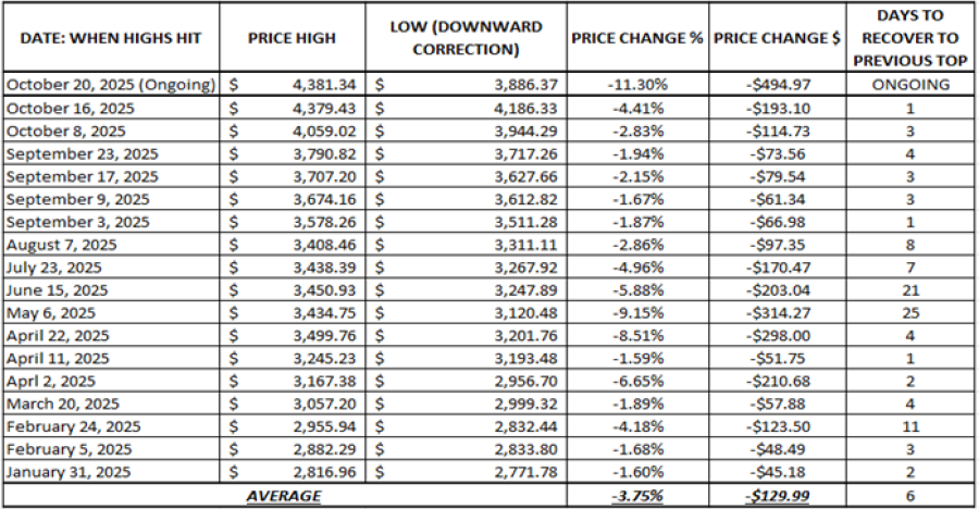 - CURRENT: THE CURRENT DOWNWARD CORRECTION IS THE 18TH THIS YEAR. Since October 20, 2025, gold has lost around $495 after testing $3,886.37 on October 28, 2025.