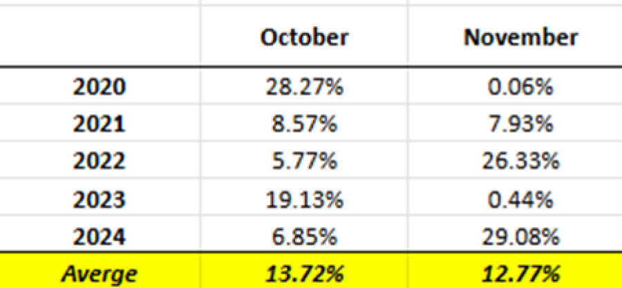 - STATISTICS (2020 – 2025): NATURAL GAS PRICES ROSE ON AVERAGE 13.72% IN OCTOBER AND 12.77% IN NOVEMBER. Historical data indicate that, on average, prices have shown a notable increase at the start of the season, with an average rise of about 13.72% in October and 12.77% in November, measured from the beginning of each month to the highest recorded levels. This pattern reflects the market’s early response to anticipated winter demand and potential supply risks. The detailed averages are presented in the accompanying table.