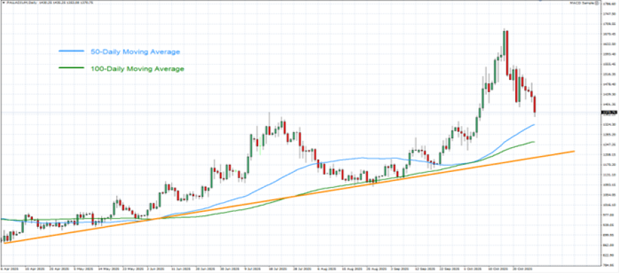 - WEDNESDAY, OCTOBER 29 AT 18:00 GMT: US FEDERAL RESERVE INTEREST RATE CUT DECISION. The Federal Reserve is widely expected to cut rates by another 25 basis points to 4.00%, continuing its easing cycle to support economic growth amid moderating inflation. A rate cut would likely weaken the U.S. dollar and boost investor demand for precious metals, including palladium.