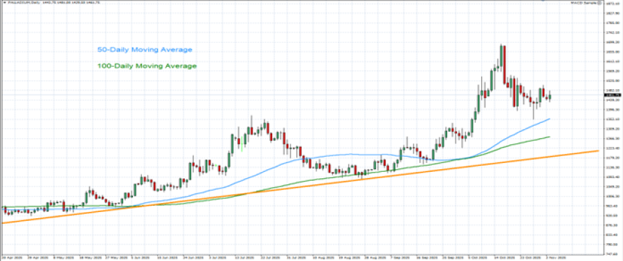 - UPTREND SINCE APRIL 2025: As shown in the daily chart below, palladium has been in a steady uptrend, supported by a rising uptrend channel since April 2025. However, the price could decline.