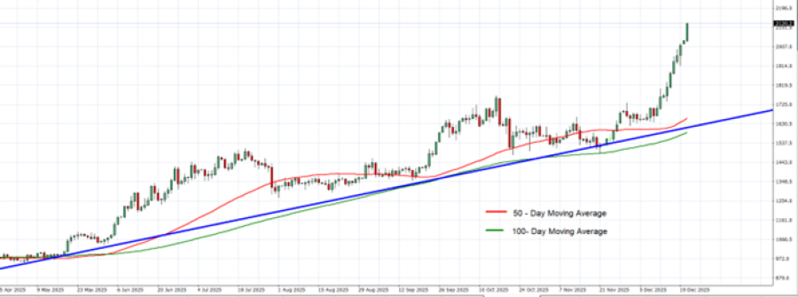 - DAILY MOVING AVERAGES CONFIRM STRONG UPTREND: Price continues to trade well above both the 50-day moving average (red) and the 100-day moving average (green), confirming uptrend.