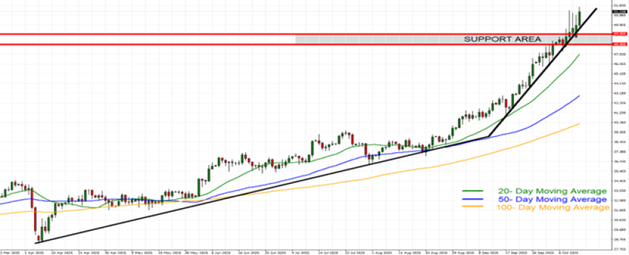 - SUPPORT AREA: $49 - $48. After hitting a fresh all-time high ($51.70), silver prices have remained above the area defined by $49 - $48, which has now become its next psychological support. Silver was last trading above $51.20.