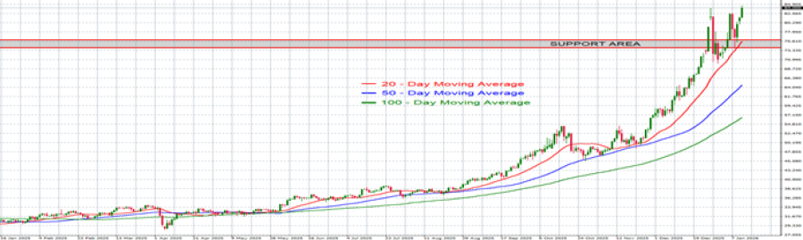 • SILVER PRICE HIT A NEW ALL-TIME HIGH ON JANUARY 12, 2025 ($84.567). Silver price has broken out to a new all-time high of $84.567, confirming the strong uptrend since the beginning of 2025, trading well above moving averages. The zone between $76 and $74 has now become silver’s new support area.