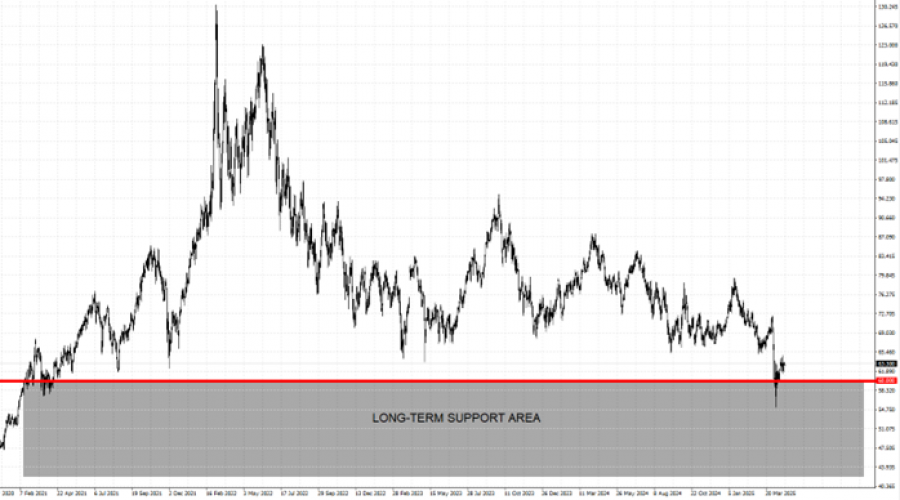 - LONG-TERM SUPPORT AREA BELOW THE PSYCHOLOGICAL MARK OF $60: Crude oil price has recently tested levels below $60, which has been acting as a support area since early 2021.