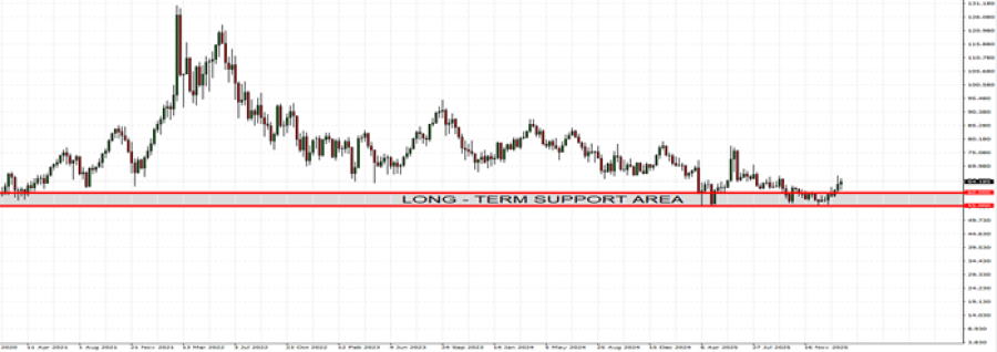 - BREAKING (DECEMBER 16, 2025): CRUDE OIL HAS TESTED ITS LOWEST RATE SINCE FEBRUARY 2021 ($54.865). The crude oil price has tested its lowest rate since February 2021. Currently, crude oil is trading above the $60 mark, floating above its longer-term support area between $55 and $60.