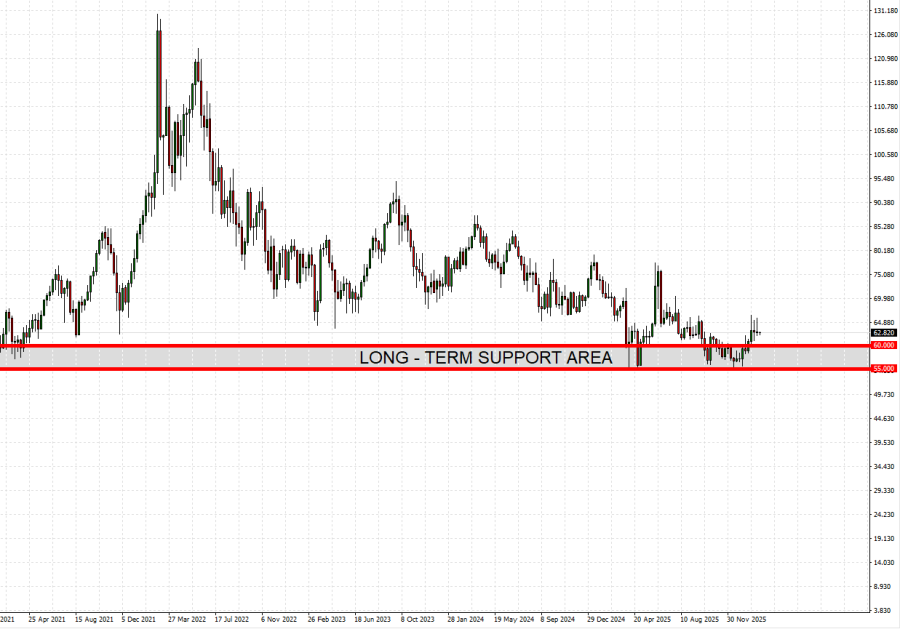 • BREAKING (DECEMBER 16, 2025): CRUDE OIL HAS TESTED ITS LOWEST RATE SINCE FEBRUARY 2021 ($54.865). The crude oil price has tested its lowest rate since February 2021. Currently, crude oil is trading above the $60 mark, floating above its longer-term support area between $55 and $60.