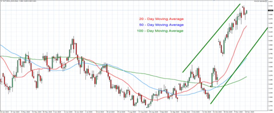 - DAILY MOVING AVERAGES SIGLANLING UPTREND: Natural Gas has been moving above the 20-, 50- and 100-day moving averages, pointing to an uptrend. However, if the price of Natural Gas drops below these moving averages the trend could reverse.