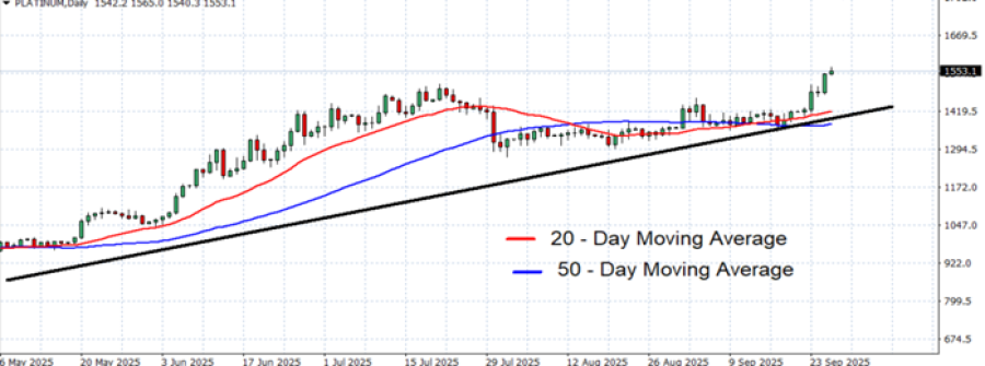 - DAILY MOVING AVERAGES CONFIRM UPTREND: The 20-day moving average (red) has turned higher, signaling short-term positive momentum, while the 50-day moving average (blue) also below the current platinum price. With price trading back above both averages, the sentiment is expected to remain positive.